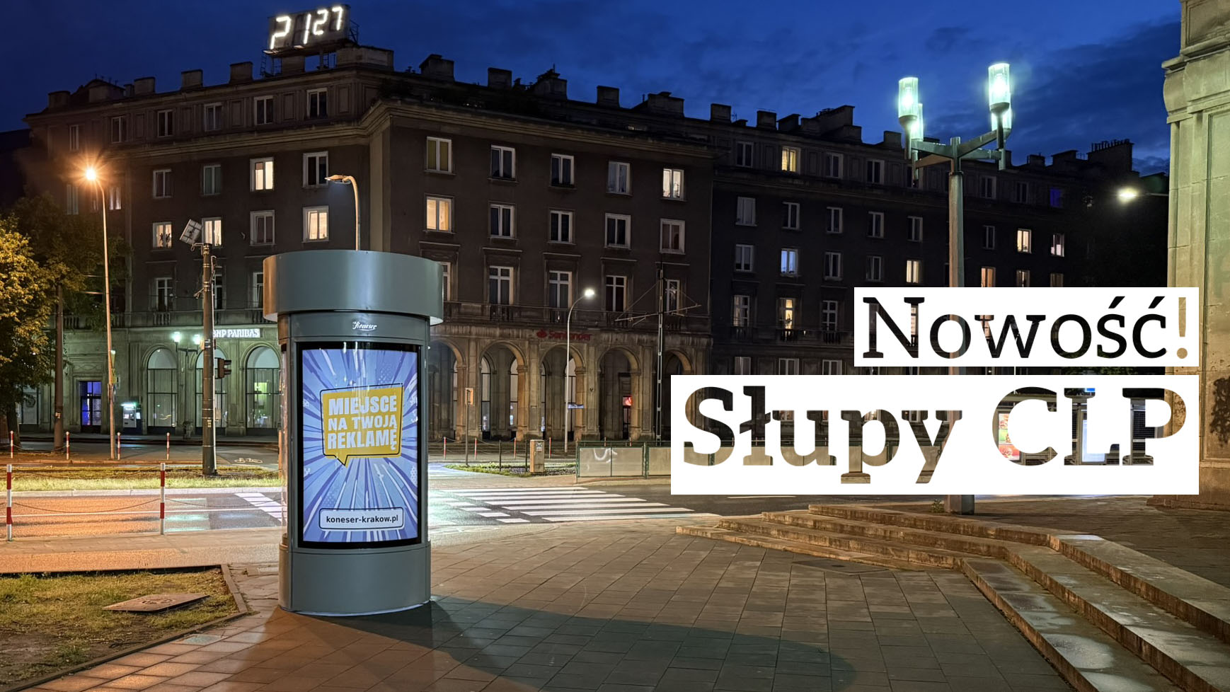 Nowość! Słupy reklamowe CLP. Bądź widoczny w dzień i w nocy. Świętujemy wyjątkowe osiągnięcie! Oferta Koneser |Biuro reklamy i plakatowania poszerzyła się o kolejny format reklamy. Słupy reklamowe